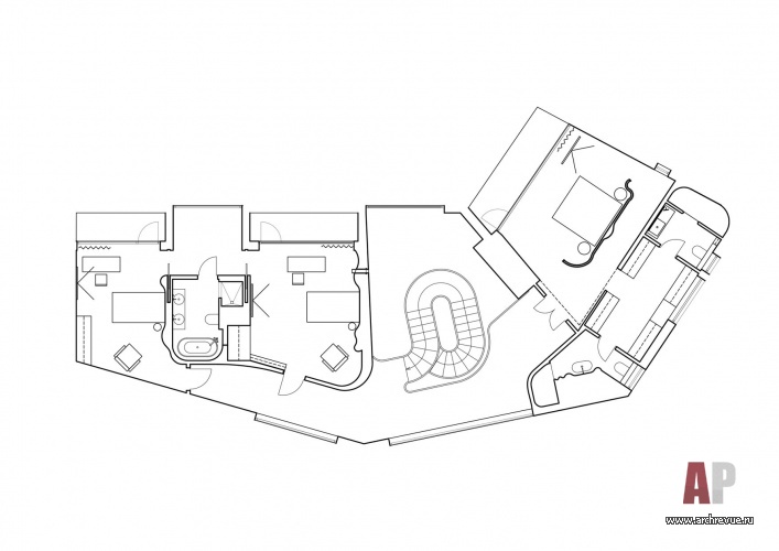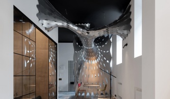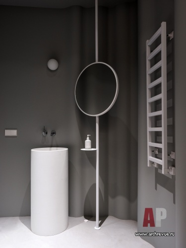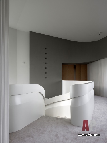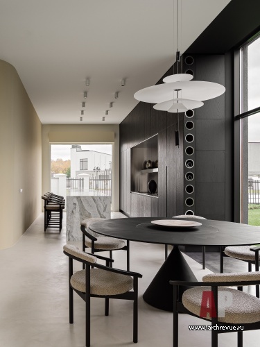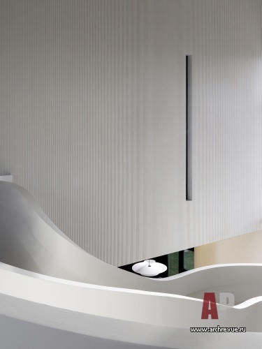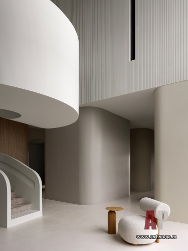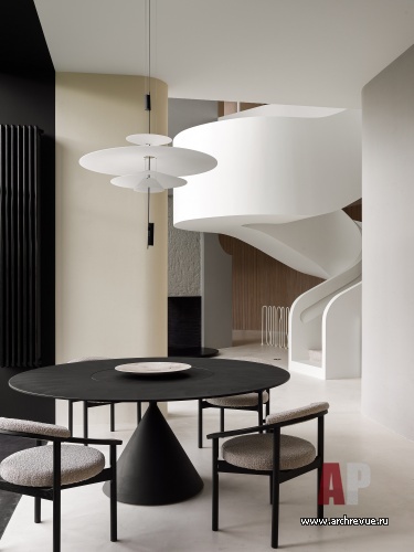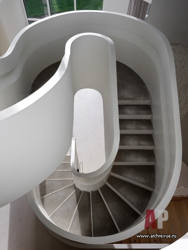 «Угловатый и несуразный исходник мы постарались кардинально переосмыслить и максимально уйти от ассоциаций с окружением. Угловатость заменили плавностью, незавершенность – законченностью, пренебрежение к деталям – педантичностью. А очевидно избыточный и абсолютно нефункциональный второй свет решили использовать с размахом, заняв его центр плавной, извивающейся монолитной лестницей», - рассказывает архитектор Сергей Колчин. Эта лестница в пустоте и стала визиткой проекта.