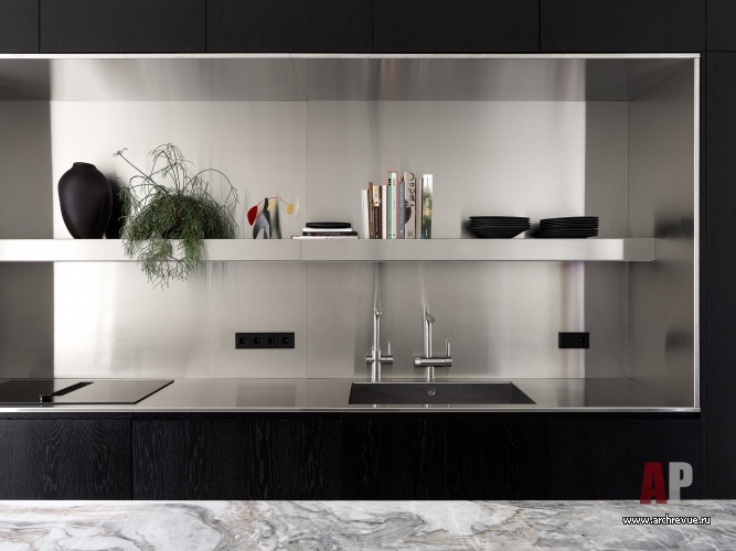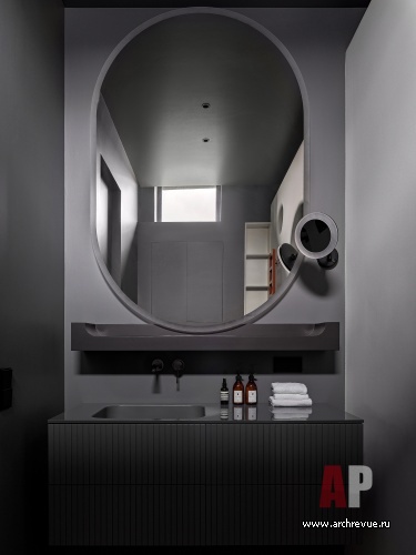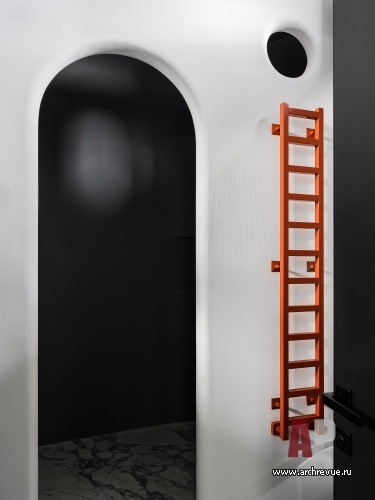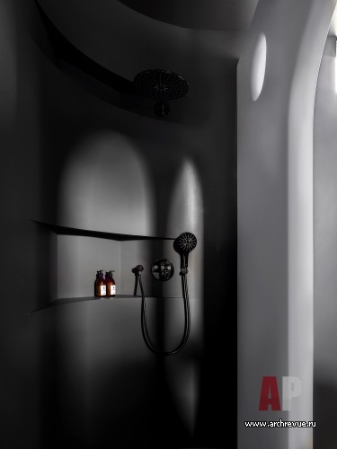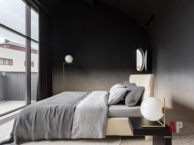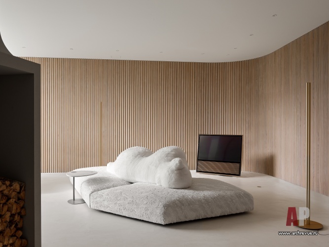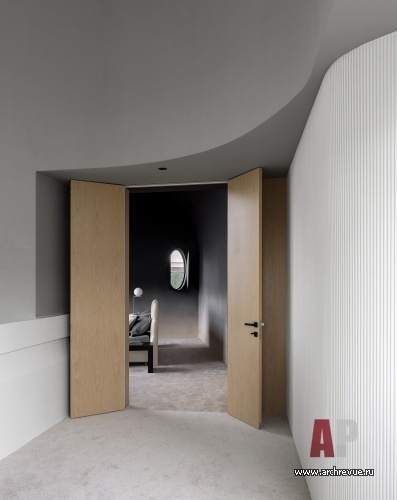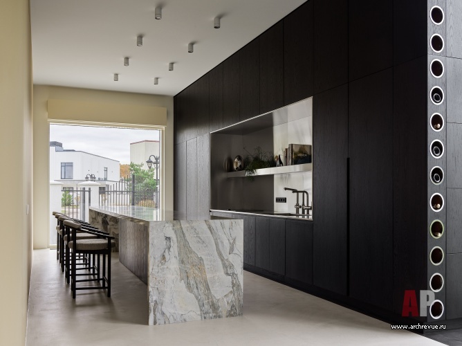 Исторические отсылки имеет и фантастической красоты свод в спальне хозяев. Микроцемент, бетон, деревянные рейки еще больше акцентируют экспрессивную архитектуру дома, его основу, костяк. Скругленные углы, арочные проемы, волнообразные бетонные стены – все это напоминает театральные атрибуты, сценографические элементы, занавес, но поданные с помощью современных форм и материалов. Связь с профессиональной сценой не случайна: заказчица – пианистка и балерина с успешной карьерой. Заказчик же – бизнесмен и страстный любитель готовить. Специально для него архитекторы спроектировали большую кухню с пятиметровым островом и оснащением мишленовского ресторана.