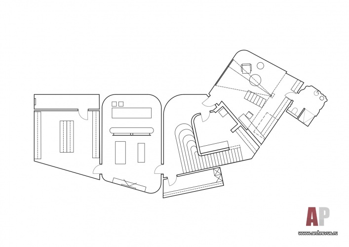Первый этаж – практически единое, максимально открытое пространство. Гостиная, столовая и кухня объединены по смыслу и визуально, волнообразные стены и перегородки придают пространству экспрессии. На втором этаже во входном крыле расположены детские спальни, а в противоположном – спальня хозяев с гардеробной и двумя санузлами. Цокольный этаж занимают тренажерный зал (заказчик занимается триатлоном, заказчица – балетом), сауна и технические службы.