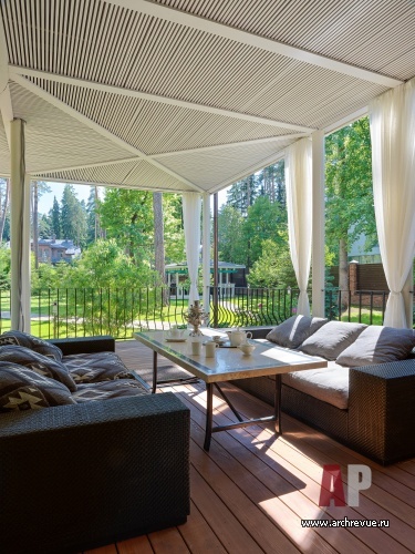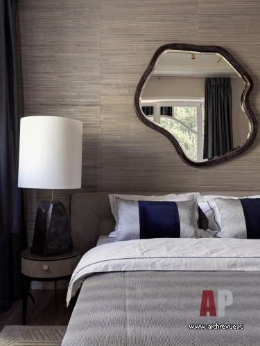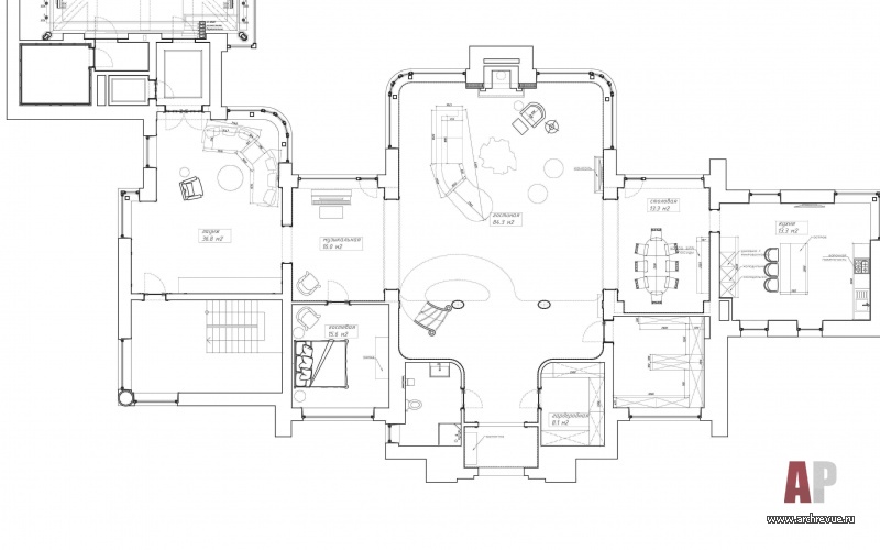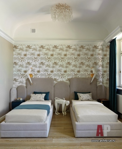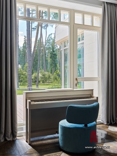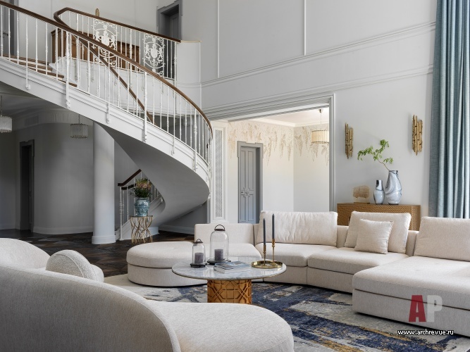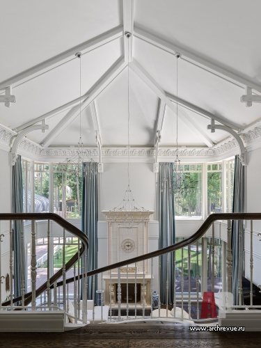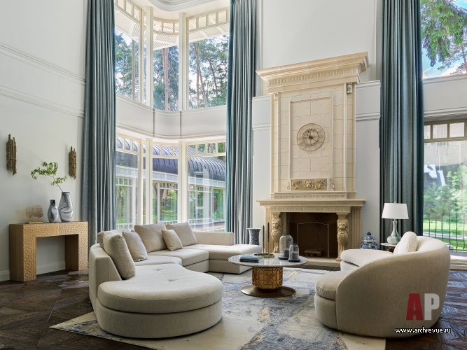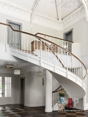 Металлические перила винтовой лестницы заменили на деревянные», - отмечают дизайнеры. Элементы неоклассики и ар-деко они деликатно вплетали в помпезную архитектуру самого дома, в котором соединились приметы классицизма, готики и модерна. Чего только стоит сводчатый готической потолок и двери с лилиями, а также обтекаемые окна с витиеватым декором. К слову, эту сложную геометрию окон и винтовой лестницы дизайнеры стремились еще больше подчеркнуть округлыми формами мебели, диванами. В качестве основного цвета они выбрали прохладную голубую гамму, которая невероятно освежает классическую основу и перекликается с природным пейзажем, который проникает сквозь витражные окна.