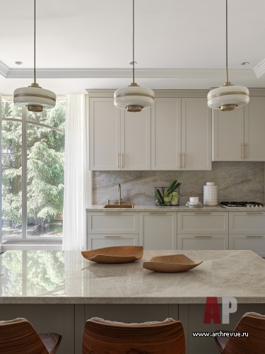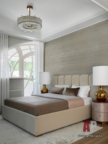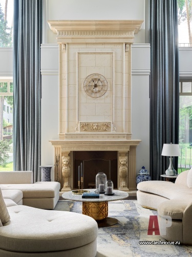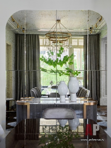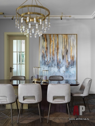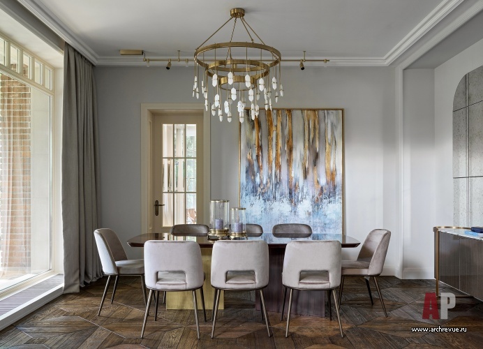 Дом построен в классической стилистике, а поскольку внешнее должно соответствовать внутреннему, в интерьере так же преобладает классика. Но легкая, элегантная, современная и даже умиротворяющая. «Мы заменили всю барочную мебель, хрустальные люстры, обои с вензелями на более лаконичные и современные предметы. На стенах использовали однотонную краску и акцентные текстильные обои ручной работы. Вместо одной чрезмерно декорированной люстры в гостиной использовали три, точечно выделив зоны.