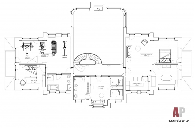 Второй этаж оставили в прежнем виде: большая спальня родителей со своей ванной комнатой и гардеробной, две спальни детей и внуков (каждая с санузлом) и тренажёрный зал. Также дизайнеры уделили внимание зонам для досуга, бассейну, сделали уголок с теннисным столом, а также сауну и соляную комнату.