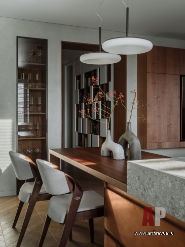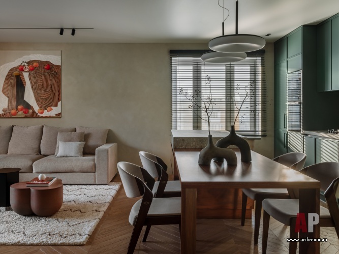 В проекте предпочтения отдавались натуральным материалам. На полу – инженерная доска с раскладкой «елочка», на стенах – шпонированные панели, декоративная штукатурка с тактильным эффектом и матовая краска. Для столешницы острова и фартука на кухне использован травертин песочных оттенков. Окна декорированы деревянными жалюзи, которые создают камерность и дают красивую игру светотени на поверхностях.