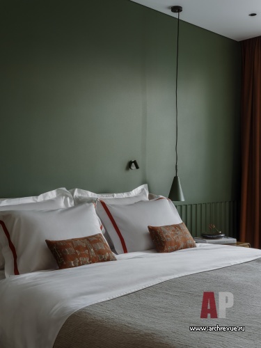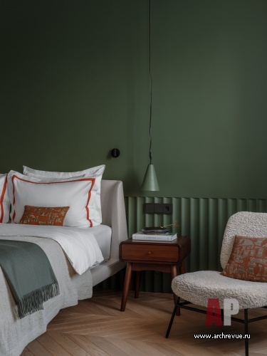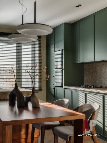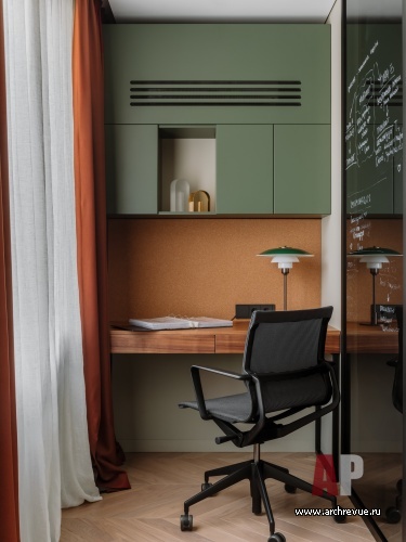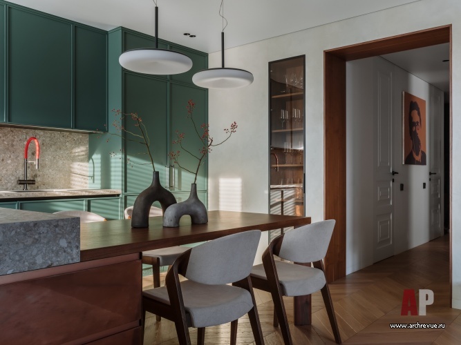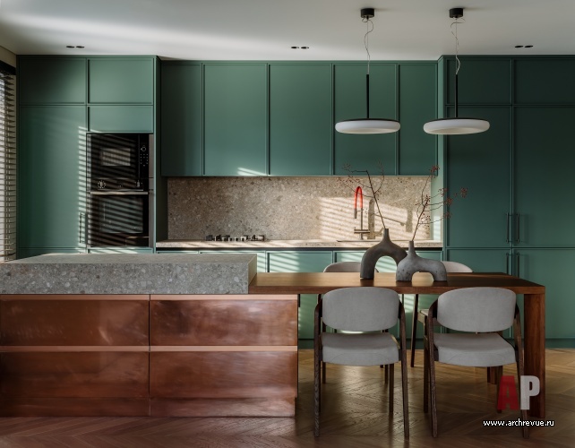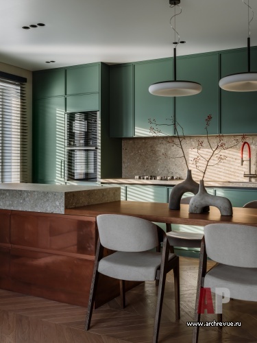 Ключом к облику квартиры стала необычная цветовая гамма – насыщенная, природная, осенняя. Заказчики четко сформулировали техническое задание: кухню и спальню они видели зеленого цвета, акцентные элементы терракотовыми. Чтобы добавить в общую композицию контраст, дизайнер использовала шпон ореха и натуральную медь (в отделке кухонного острова), они еще сильнее подчеркнули красоту выбранной палитры.