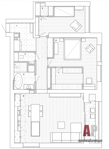 Узкий коридор дизайнер частично включила в общую зону, максимально расширив пространство. Кухню объединила с гостиной и расположила на удалении от входа, две спальни, гардеробную и два санузла разместила компактно, ближе ко входу. Такая компоновка обусловлена наличием большой лоджии, которую следовало сделать продолжением общей зоны. На ее территории организован бар.
