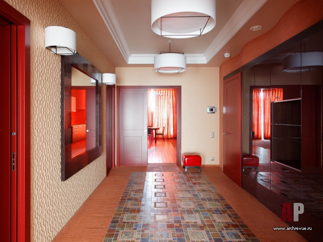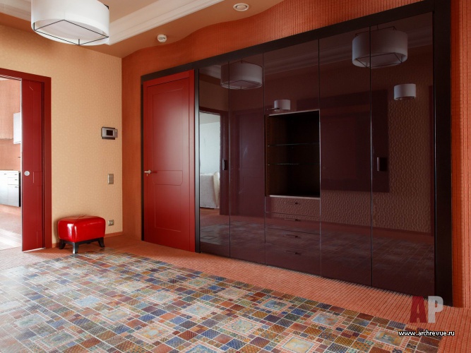 Планировка квартиры отличается простотой и рациональностью. Вход в квартиру предваряет небольшой тамбур, оттуда попадешь в прихожую-холл со встроенным шкафом вишневого цвета с глянцевой поверхностью. Налево – дверь в гостиную, объединенную с кухней, направо – в спальню.