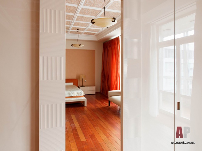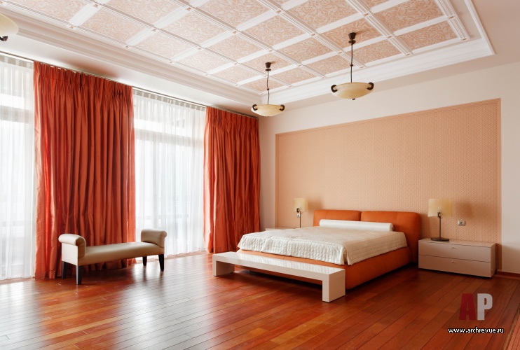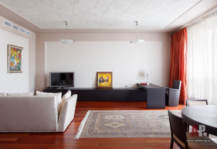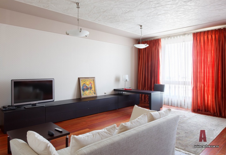 В минималистичном по сути интерьере присутствуют черты испанского стиля мудехар, сочетающего в себе приметы готики и мавританского искусства. Дань ему – мозаичное напольное панно в прихожей, оранжево-терракотовая гамма текстиля, плитки, мозаики и элементов декора (даже двери выполнены в этом цвете!). А главное – оригинальное оформление потолков. Затейливый рельеф сделан методом трафаретной печати, в гостиной он оставлен белоснежным, а в спальне дополнительно оттонирован в сложный терракотовый оттенок.