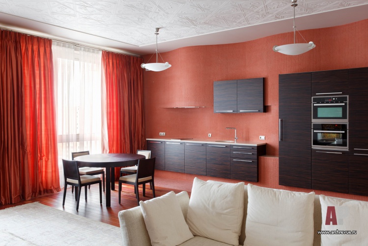 Работая над проектом, мы ничего специально не придумывали. Стена волной появилась из-за того, что нам надо было спрятать вертикальные коммуникации, которые стали видны из-за присоединения кухни к гостиной. А также из-за потребности нивелировать саму кухонную зону. Поэтому мы решили кухню утопить в стену, сделав поверхность стены волнообразной. Так родилась и основная декоративная тема, которая объединила небольшую квартиру.