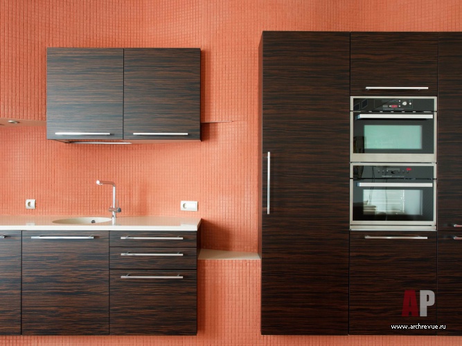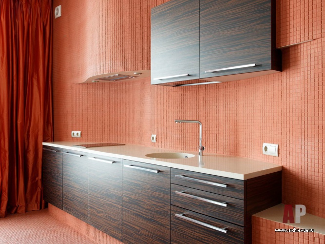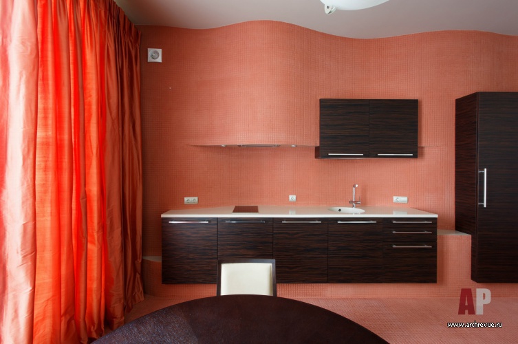 Главная декоративная тема, которая объединяет все помещения квартиры – волнообразная стена, облицованная матовой мозаикой терракотового цвета. В прихожей в нее встроен шкаф, в спальне – роскошная белая гардеробная, в общей зоне вмонтирована кухня и кухонное оборудование.