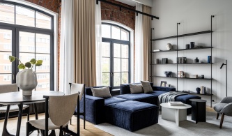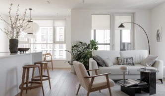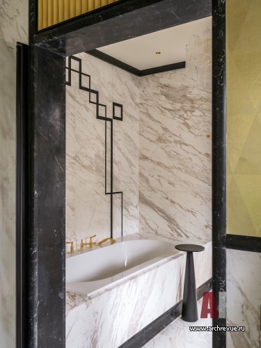 Например, в проходной гостиной сделал симметричную зону отдыха с островными диванами, выровнял высоты порталов декоративными обрамлениями из мрамора, продублировал акцентное настенное панно холла в общей зоне, тем самым связав пространство воедино.