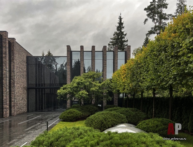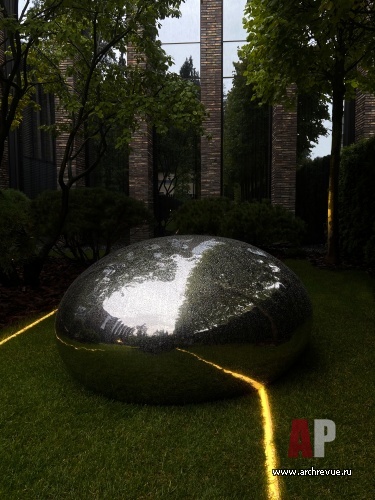 Кроме того, сам облик дома с его массивной архитектурой, линейной геометрией диктует объемные, гиперболизированные формы элементов ландшафта. В частности, четырехметровые лестницы из серого камня, парящие ступени из гранитных плит, строгие колонны из лип, широкие мощеные дорожки с интегрированными газонами, круглые кустарники. Они перекликаются с бионической формой арт-объектов из нержавеющей стали, выполненных на заказ, специально для этого проекта. Особенную выразительность ландшафту придает светодиодная подсветка: яркие пунктиры линейных светильников, смонтированных как в плитах мощения, так среди зеленых газонов, и перекликающиеся со стеклянными фасадами дома.