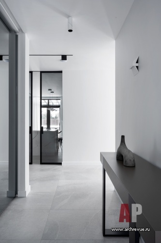 Сложность данной лестницы была в том, что ее конструкцию сваривали и красили уже на самом объекте», - отмечает архитектор. С белым фоновым дизайном гармонирует шпонированный дуб и светло-серый крупноформатный керамогранит. Крупная нарезка, большие плоскости заливки, отсутствие мелких деталей делают интерьер очень собранным и функциональным.