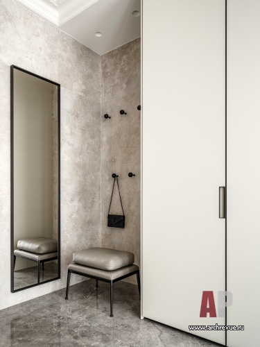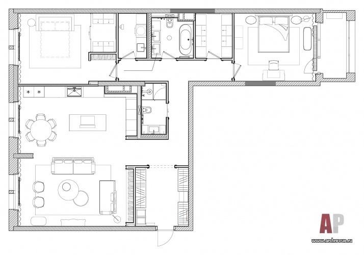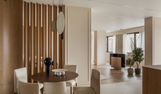 Здесь есть и небольшой парадный холл, и классическая анфилада с двумя парами распашных дверей, и большое общее пространство с хорошими пропорциями, большими окнами и обилием воздуха. Планировка выстроена по осям и имеет четкое зонирование: от общей гостиной-столовой-кухни внутренним коридором отделен приватный блок с двумя спальнями, санузлами и гардеробной. При входе также организована скрытая система хранения для верхней одежды, чтобы ничто не отвлекало от красоты интерьера и открывающихся от прихожей перспектив.