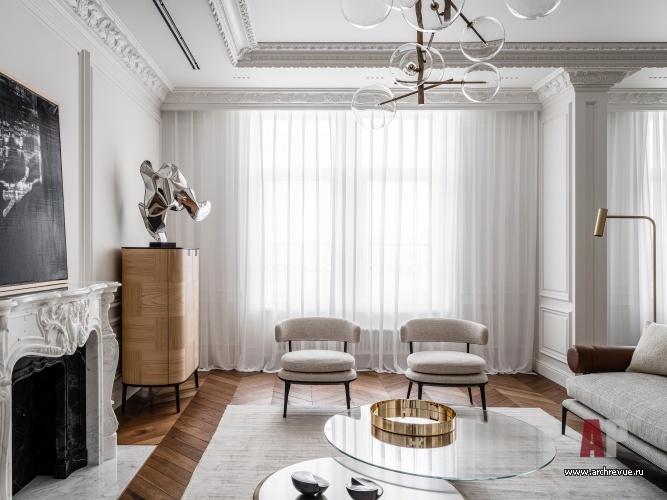 Идея интерьера – современная классика с французским настроением. Основа интерьера – традиционные атрибуты классики: паркет из античного дуба, изготовленный на заказ на итальянской мануфактуре из столетнего дуба и уложенный классической французской елкой, лаконичные деревянные дверные полотна, белые стены с изящным лепным декором…