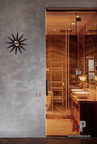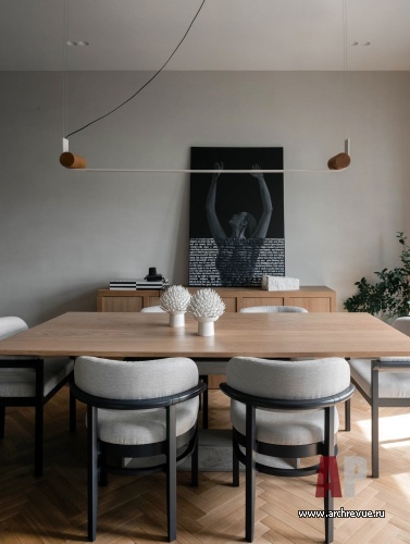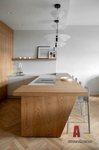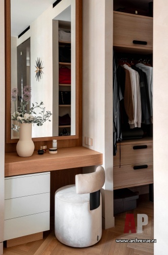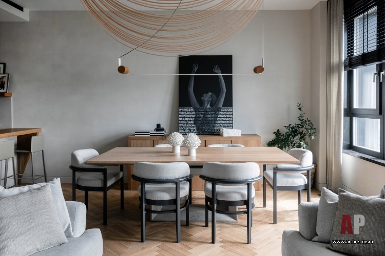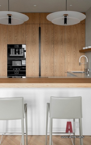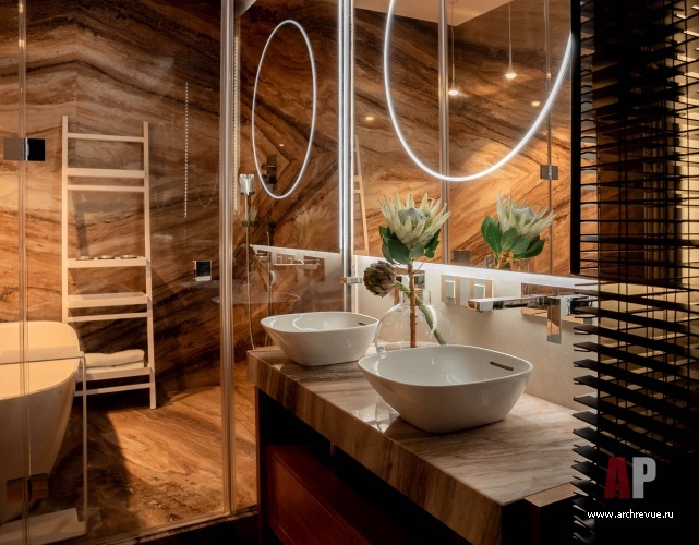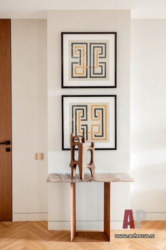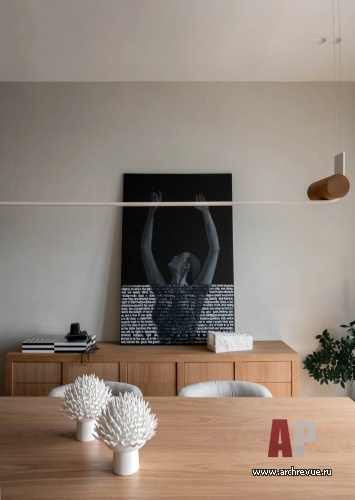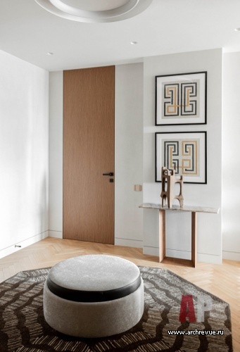 Она имеет состаренный эффект и придает пространству ощущение творческой незавершенности, даже некоторой небрежности. Еще один характерный акцент – изделия из светлого дубового шпона с красивой текстурой, они изготовлены на заказ по эскизам автора проекта. Натуральный паркет, природный мрамор, ткани из органических тканей, деревянные жалюзи как нельзя лучше поддерживают в этом интерьере идею благородной роскоши.