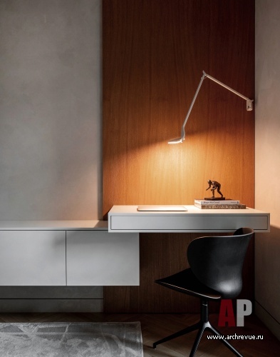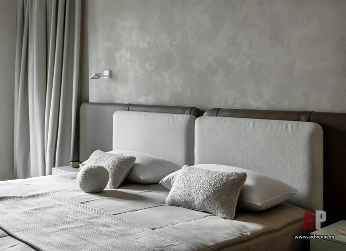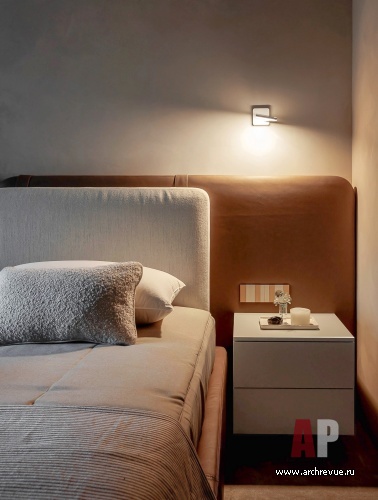 Спальня кровать из натуральной кожи и льна Woodfans, на заказ; корпусная мебель из шпона дуба, на заказ, по эскизам дизайнера; рабочий стул BoConcept, кресло Archipélago