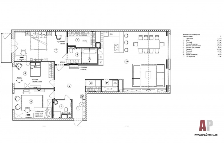 Квартира площадью 140 кв. м сдавалась в свободной планировке. Первоначально сложностью казались монолитная колонна и вентиляционная шахта, расположенные в самом центре квартиры. Однако в процессе создания дизайн-проекта их удалось чрезвычайно удачно обыграть: сделать отдельный блок мокрых зоны и организовать прекрасный просторный холл.