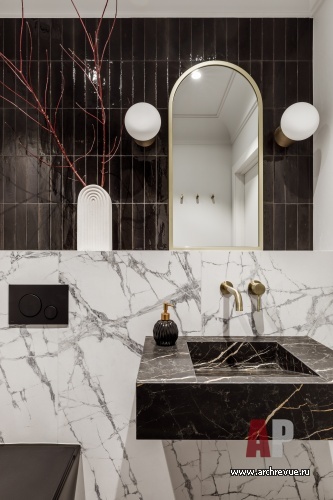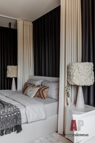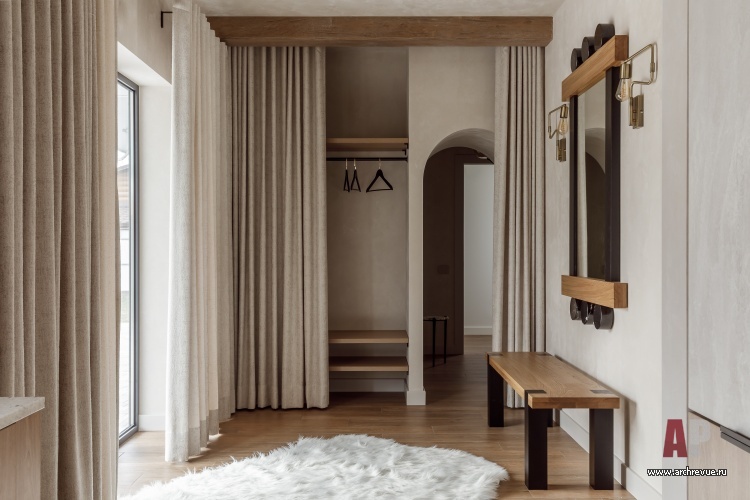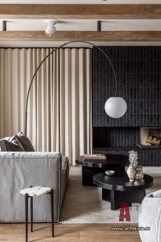 В качестве акцентов выбраны оттенки черного и темно-серого. Они привлекают взгляд уже при входе в дом в элементах зеркала и скамьи и продолжаются в эффектной облицовке каминного портала и журнальных столах гостиной. В спальне черные шторы по периметру помещения создают ощущение уюта и защищенности, а в санузле черный керамогранит под мрамор с красивыми рыжими прожилками продолжает природную тематику.