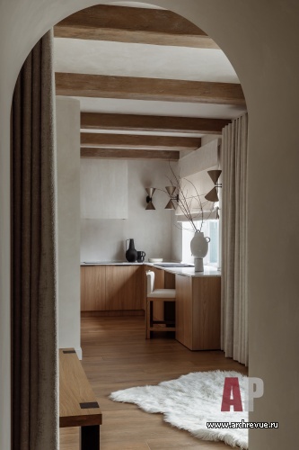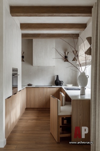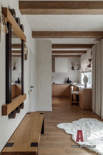 Интерьер оформлен в стиле современного шале. Цветовая палитра выбрана нейтральных природных оттенков. Акцентной фактурой сделано дерево – натуральный шпон в отделке мебели, декоративные потолочные балки и керамогранит под светлое дерево. Он использован в оформлении практичных теплых полов.