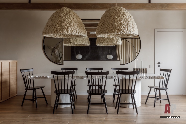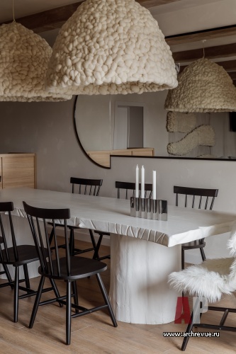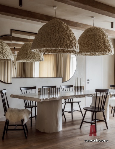 Мебель подобрана по принципу экологичности и практичности. Большая часть предметов была изготовлена на заказ в местных мастерских по эскизам дизайнера. Особый шарма интерьеру придают изделия hand made: подвесные светильники-чаши над обеденным столом, гобелен «Полет» в гостиной из шерсти мериноса, настольные «вязаные» лампы Helen Loom в спальне.