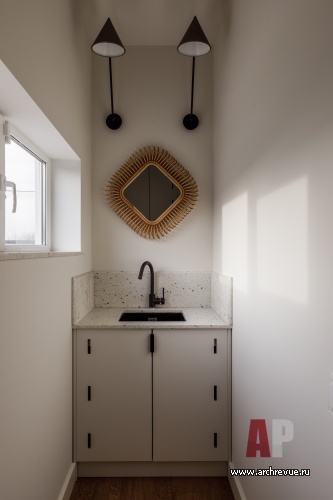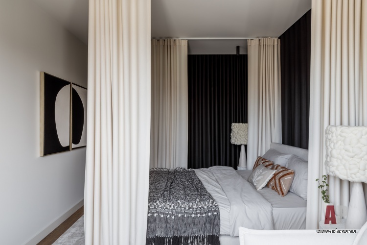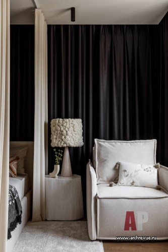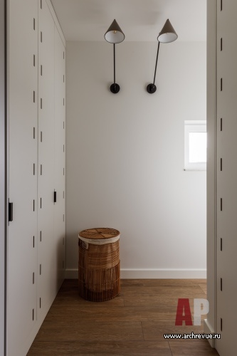 Из гостиной организован проход в гостевую спальню. На случай, если гости остаются с детьми, в спальне предусмотрено дополнительно спальное место – раскладное кресло-кровать. Так как изначально находится в этом помещении летом было слишком жарко, а зимой холодно, дизайнер продумала меры дополнительной теплоизоляции спальни.