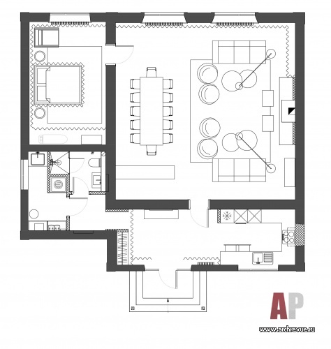 Поскольку все стены в доме несущие, основные помещения остались на прежних местах. Перепланировка коснулась только неразумно большого по площади санузла, который трансформировался в три небольших помещения: коридор, санузел с душем и котельную-постирочную.