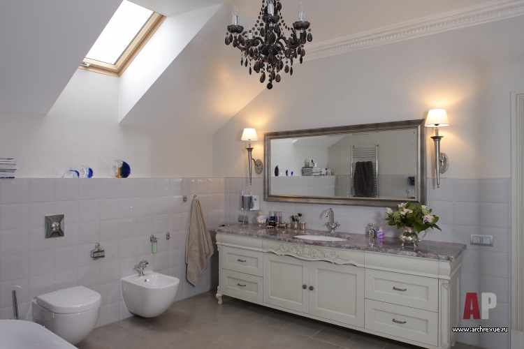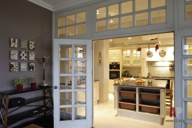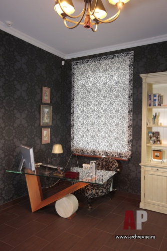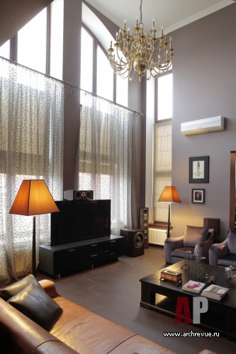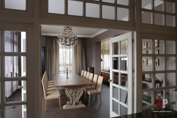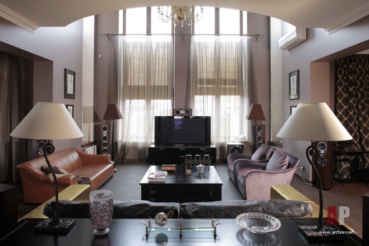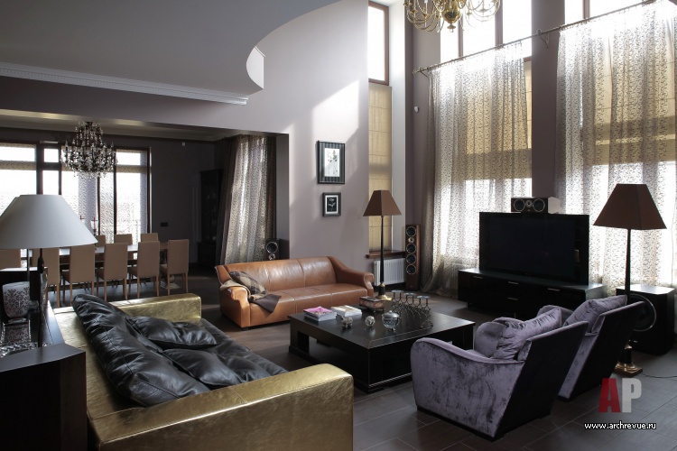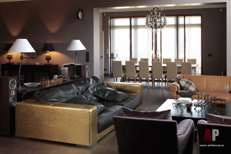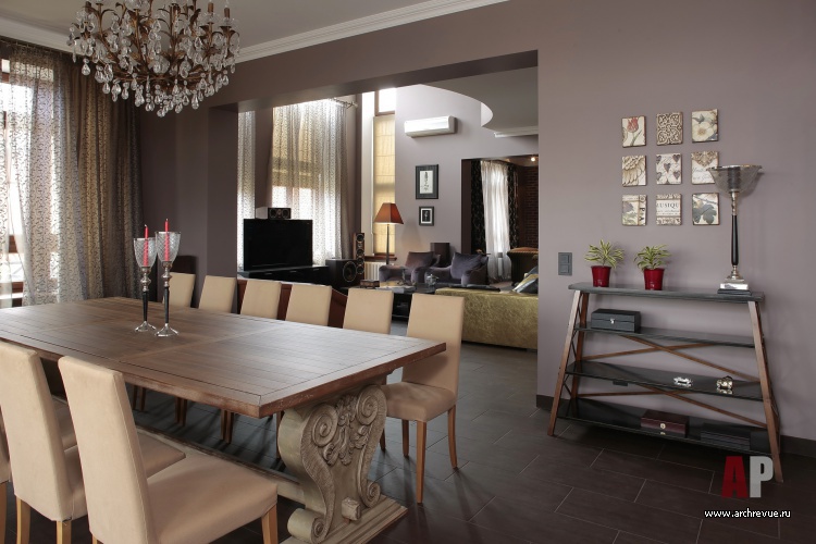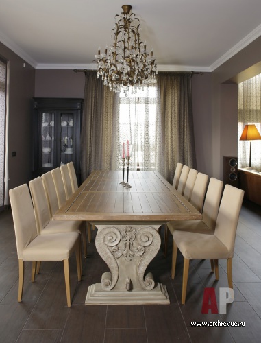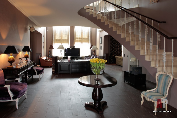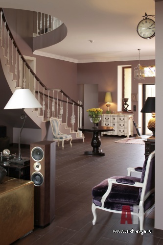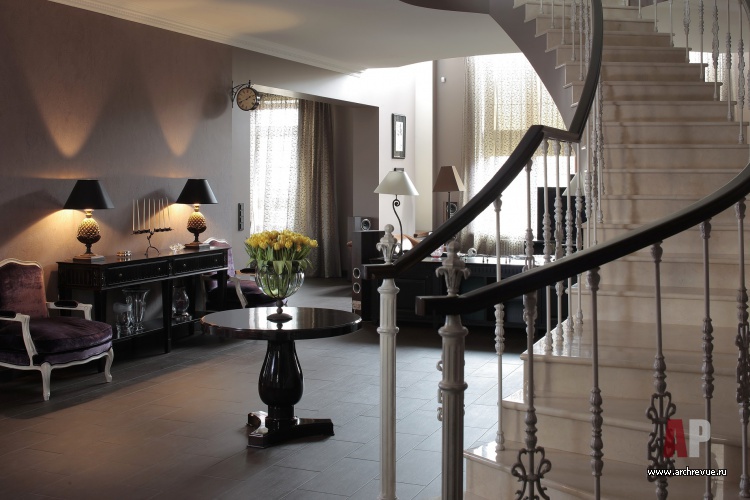 Интерьер дома эклектичен. Архитекторы смело смешивают диваны Baxter в стиле ар-деко с консолями и шкафами в духе Прованса, кирпич с мрамором, ковку с английским орнаментом с хрустальными светильниками. Но еще смелее они поступают с цветовым колоритом дома. Основной цвет в палитре интерьера – сложный сиреново-коричневый. Иногда он уходит в цвет грозового неба, «копченой устрицы» или старинного жемчуга.