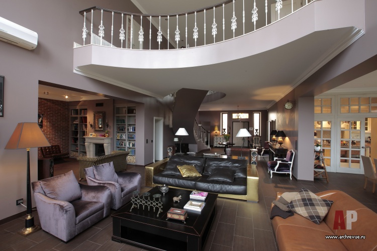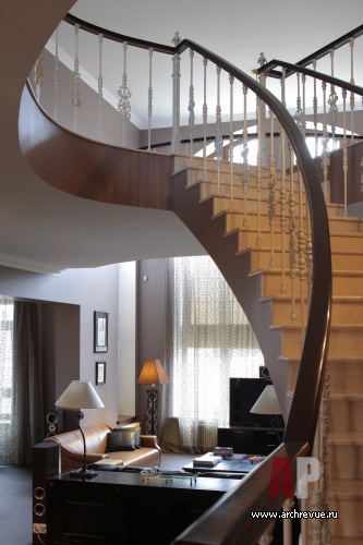 Изогнутая лестница взмывает прямо из двухсветной гостиной и вместе с балконом, украшенным коваными балясинами, является главным ее украшением.