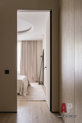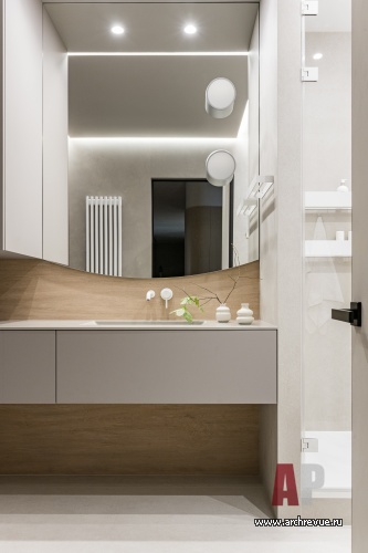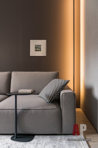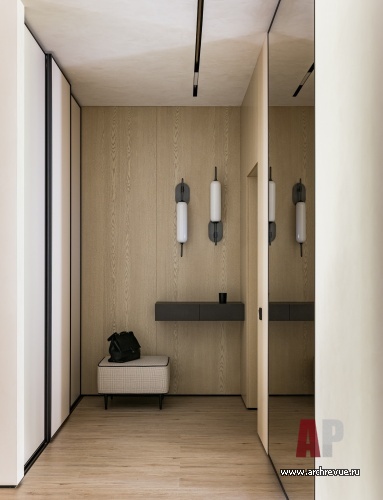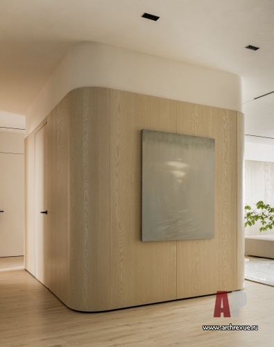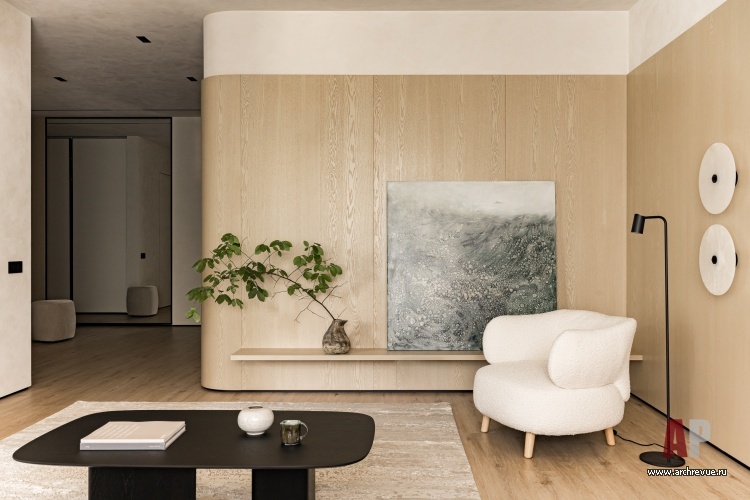 Панели из шпона ясеня, тактильные штукатурки и текстильные обои создают уютную и теплую атмосферу. Шпонированные панели огибают гардеробную, куб со скругленными углами благодаря этому смотрится очень эффектно! Эффект перетекания пространства поддерживается благодаря единому оформлению холла и гостиной.