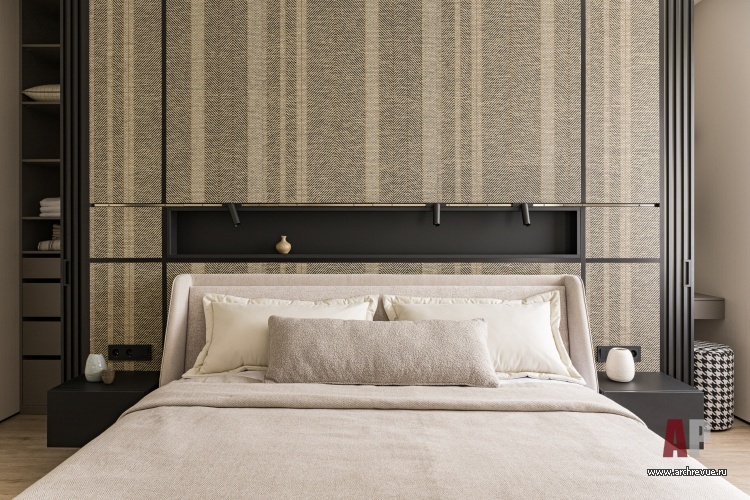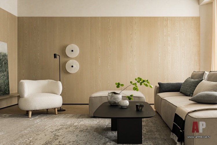 Интерьер выполнен в сдержанной манере с мягкими акцентами и обилием природных фактур.