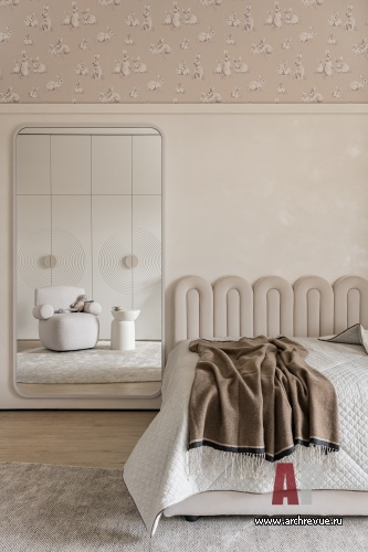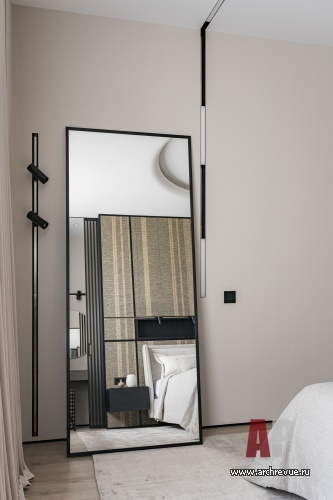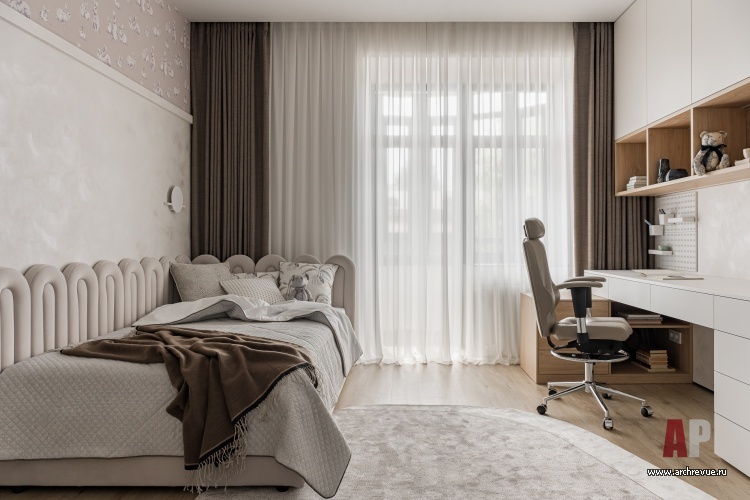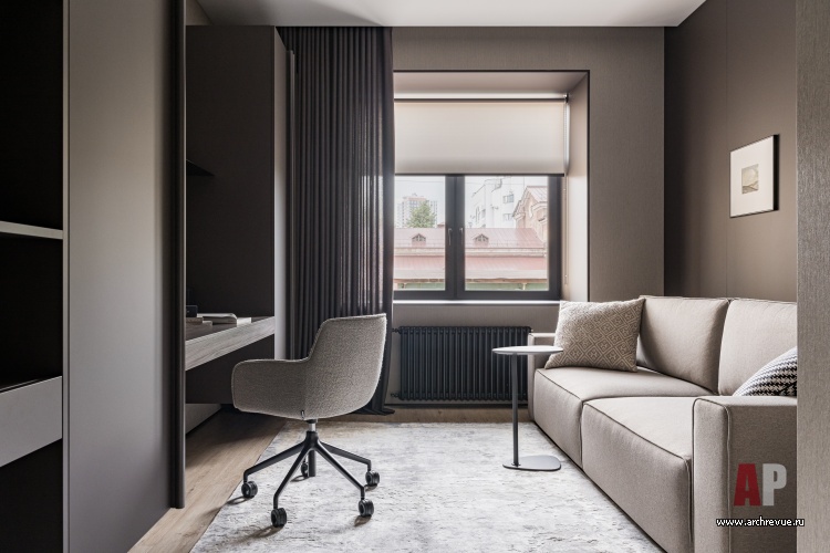 Основным пожелание заказчиков было отсутствие крупных акцентов, а также активных декоративных и цветовых доминант. Поэтому весь интерьер выполнен в пастельной теплой гамме, с нюансной деталировкой. В общей зоне светлая песочная палитра разбавлена сдержанной графикой крупноформатного керамогранита с брутальной текстурой в оформлении кухни и геометрической формой современных светильников. В спальне привлекает внимание твидовая отделка стены за изголовьем кровати. И только кабинет выполнен в глубокой, шоколадной гамме.