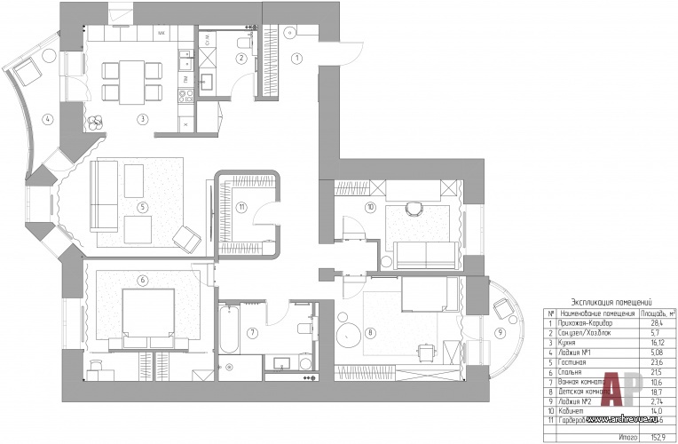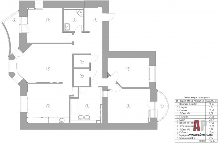 Была проведена глобальная перепланировка, в ходе которой дизайнер восстановила исходный план застройщика по расположению функциональных зон: вернула на исходное место кухню (ранее она занимала спальню), скорректировала сложную геометрию кабинета, увеличили мастер-ванную, где разместили большую ванную и душевую, превратила в полноценное хозяйственное помещение гостевой санузел.