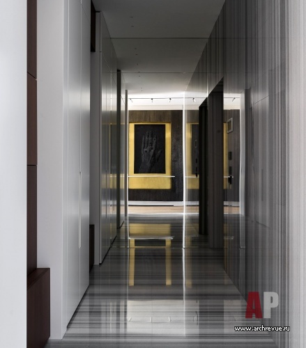 Классические шпонированные панели, микроцемент с живой рельефной текстурой, дубовая паркетная доска создают эффект «коробочки». В то же время мебель облегченной конструкции и минимально декорированные окна сохраняют в приватных, насыщенных по цвету и текстурам помещениях ощущение воздуха.