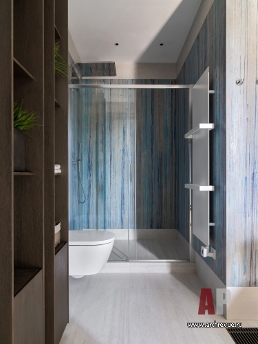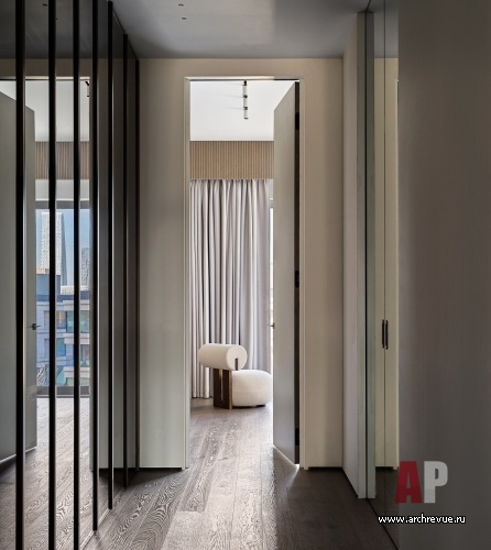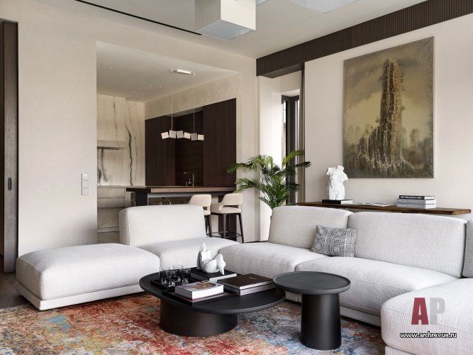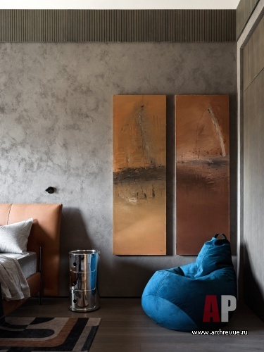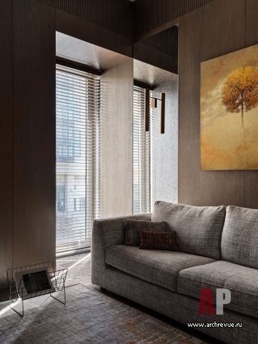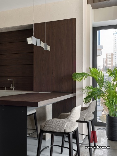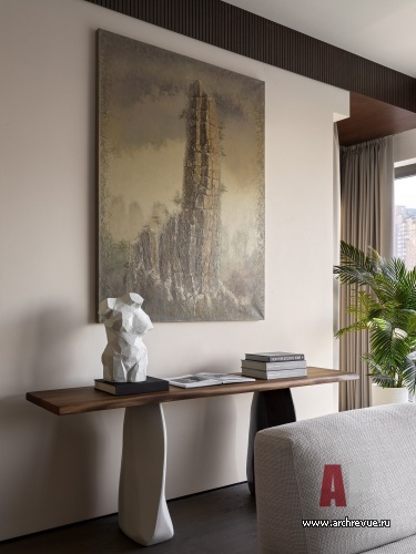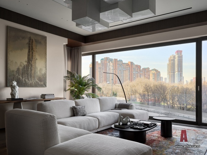 Заказчик – топ-менеджер финтехкомпании, интересуется последними техническими достижениями, его супруга увлекается современным искусством, а сын-тинэйджер занимается киберспортом. Все вместе они хотели современную и «продвинутую» квартиру с качественными материалами, эффектными деталями, но без китча. На облик интерьера во многом повлияло расположение дома и панорамные виды из окон на приватный парк с одной стороны и на магистраль с перспективой высоток с другой. Сдержанная природная палитра и урбанистические акценты стали основой декоративного решения пространства.