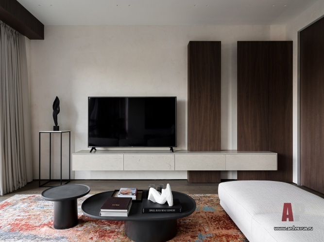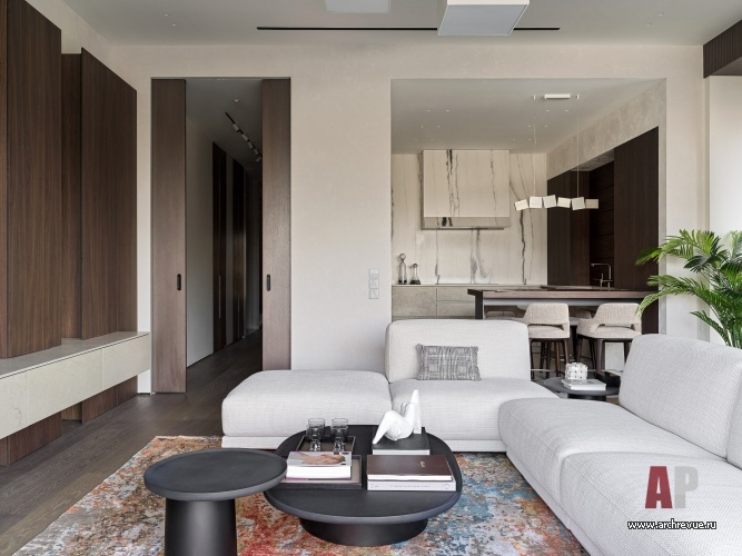 Гостиная диваны Poliform, журнальные столики Molteni &C, консоль Cattelan Italia, композиция под ТВ Modulnova