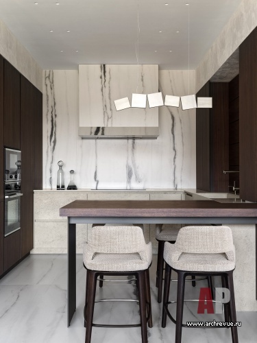 Центральная композиция гостиной – мягкая группа, состоящая из двух диванов и трех столиков. Все предметы довольно крупные и сомасштабные друг другу. ТВ зона выполнена из модулей в той же отделке, что и кухня – шпоном дуба и камнем Pietra Piasentina Fiammato. Строгую геометрию поддерживает ассиметричный каскадный светильник Vibia и лаконичный дизайн окон с фризом в столярном исполнении и шторами на электроприводе.