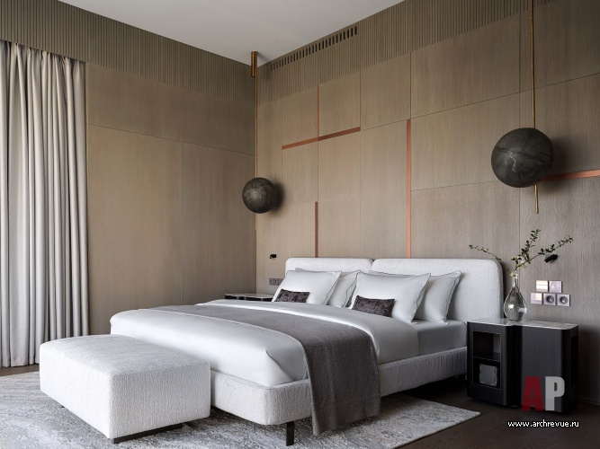В спальне концепцию сдержанной элегантности транслирует оформление стен панелями из светлого дуба с металлическими вставками.