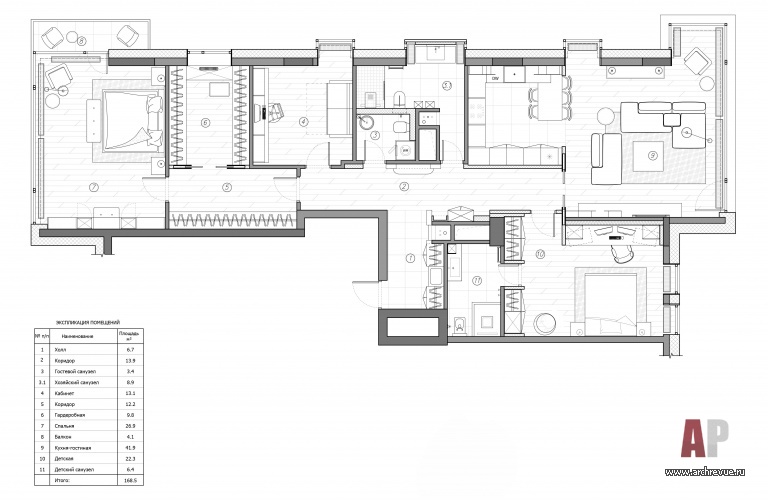 Квартира сдавалась в бетоне и представляла собой вытянутый прямоугольник, притом довольно неудобный, всего с двумя точками подключения коммуникаций, что сильно ограничивало возможности перепланировки.