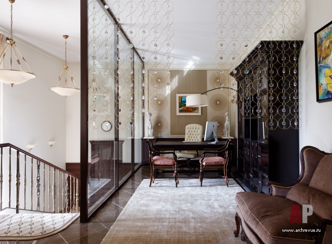 Оригинально решен кабинет. Изначально для него в квартире не было предусмотрено места, но архитекторы предложили разместить кабинетную зону в проходном холле второго этажа. Они выделили ее стеклянными перегородками и оригинальными светильниками.