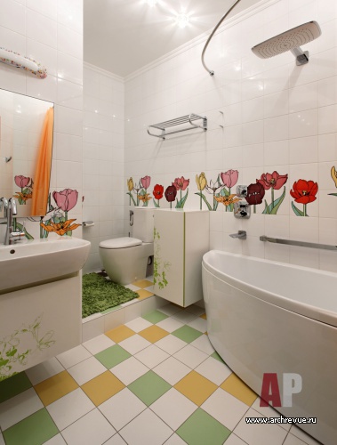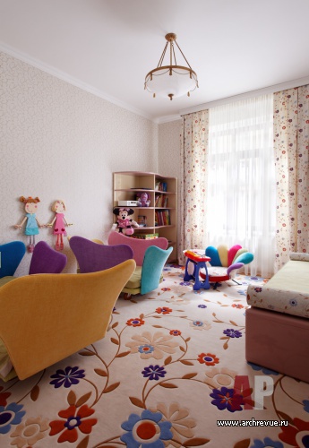 Условно квартира поделена на три части: гостевую, родительскую и детскую. Общественная территория состоит из входной зоны, гостиной, домашнего кинотеатра и кухни. Отдельными блоками воспринимаются спальня хозяев с санузлом и детские с игровой и гардеробной.