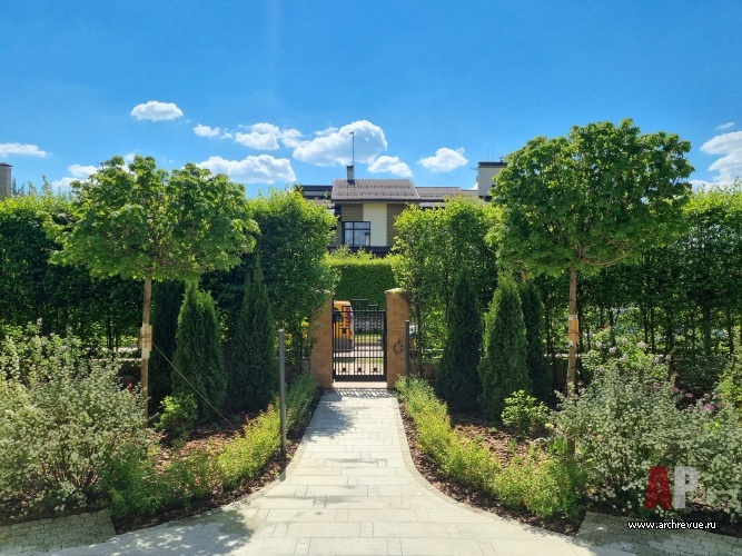 Парадная часть сада со стороны подъезда и главного фасада выполнена с использованием регулярных элементов: шаровидных кленов Глобозум, стриженных изгородей из спиреи японской Фробели, которые подчеркивают торжественную архитектуру дома.