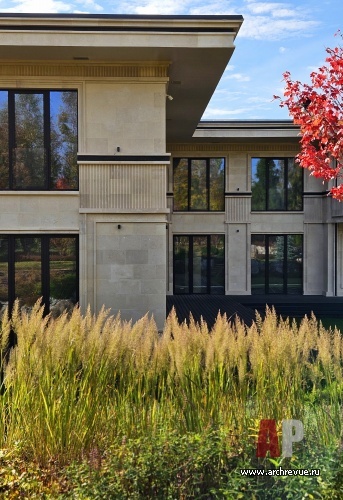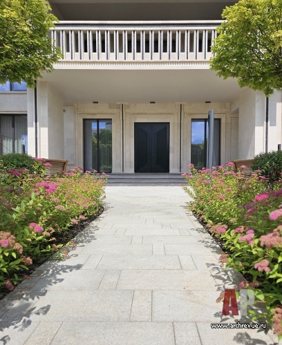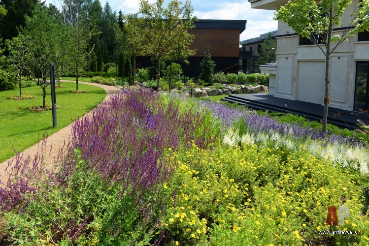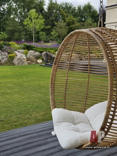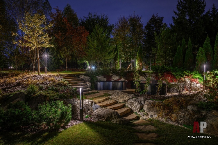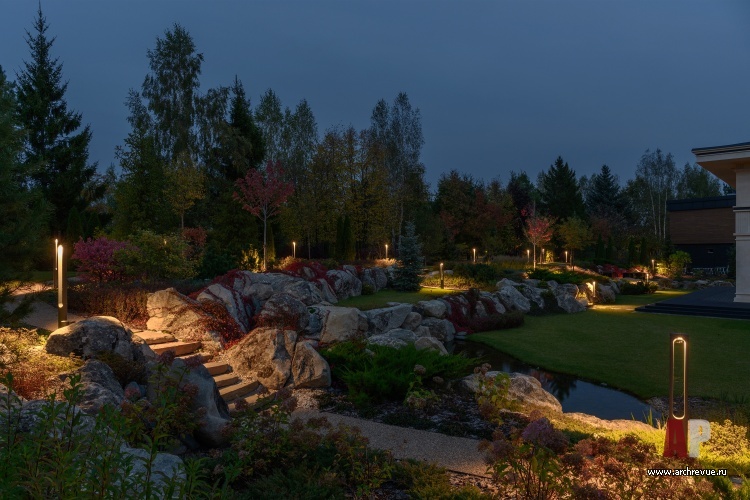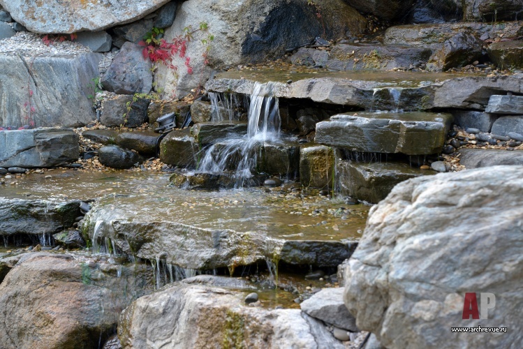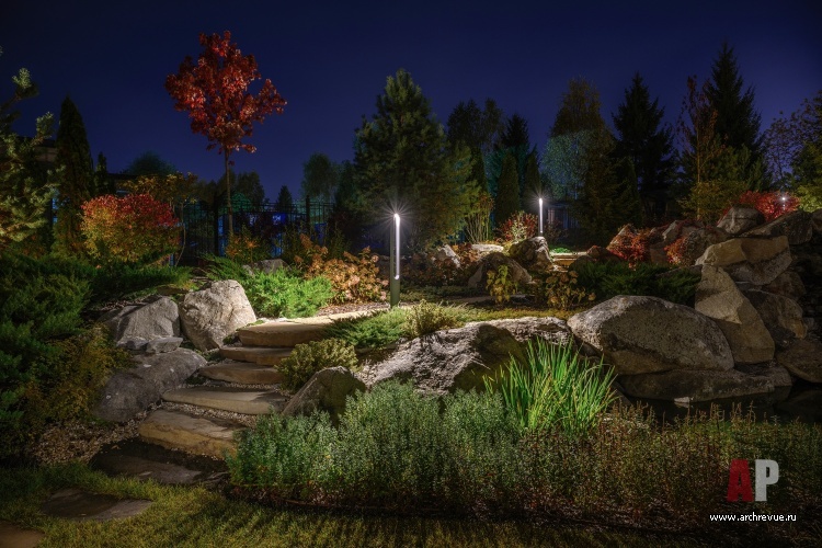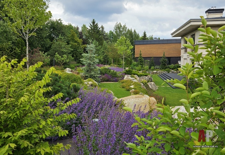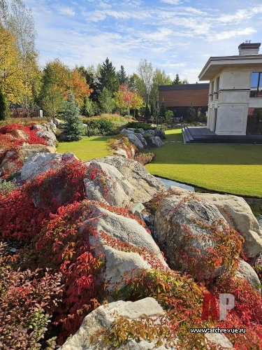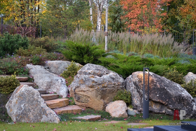 Перепад высот более трех метров и архитектура дома продиктовали необходимость создания сада из нескольких ярусов. Для его воплощения было разработано сложное инженерное сооружение – подпорная стенка из огромных, высотой от 1 до 3-х метров природных валунов. «Чтобы разделить участок на два уровня и придать ландшафту естественный вид, мы отправились на Кавказ, где отбирали камни по размеру и внешнему виду. Всего мы привезли на объект порядка 200 камней, общим весом 400 тонн. Вес самого большого составляет 10 тонн!» - рассказывают авторы ландшафтного проекта.
