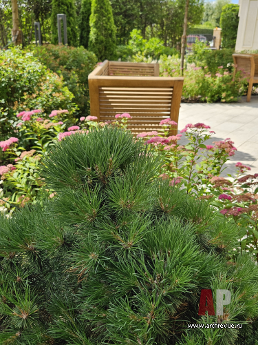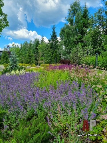 Выстроенный на нюансах с большим вниманием к деталям и качеству посадочного материла сад можно рассматривать бесконечно. Он выглядит необычайно живым и эффектным в любой сезон. Весной участок покрывается ковром из цветущих розовых флоксов шиловидных и камнеломок. Летом зацветают фиолетовые шалфеи, котовники, желтые лапчатки и разнотравье. Осенью цветовая гамма сада меняется: краснеет виноград девичий, который покрывает каменную стенку. В разные оттенки красного и оранжевого окрашиваются бересклеты, ирга, аронии и клены. Зимой декоративность обеспечивают небольшие, но множественные скульптуры, а также разнообразные хвойные: массивы можжевельников, горные сосны и ели.