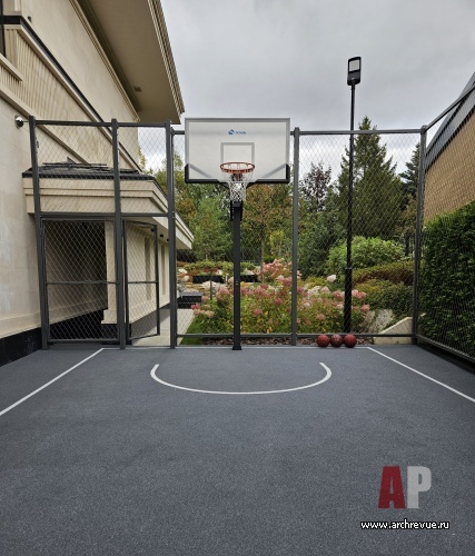 Пред домом, в самой нижней точке участке разбита просторная лужайка из партерного газона. С восточной стороны дома, в тени, спроектирована спортивная площадка для главы семьи. Баскетбольная площадка скрыта от глаз соседей стриженной изгородью из туи Брабант, высаженной на подпорной стенке между ограждением спортплощадки и забором.