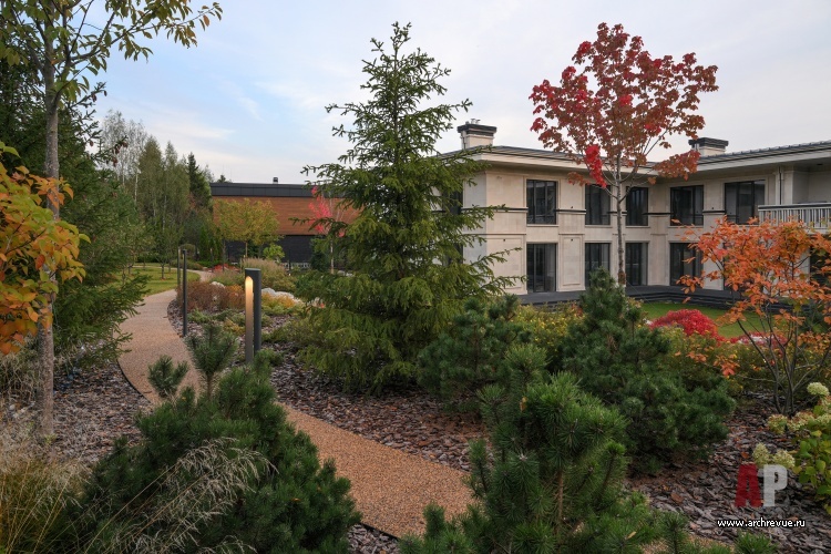 Многоуровневая структура сада позволила визуально облегчить участок, выигрышно обыграть архитектуру дома и создать разные по назначению зеленые зоны, в том числе скальный водоем с водопадом. Стилистическая особенность сада – мягкий, пейзажный характер, в основе которого обилие разнообразных хвойных растений, сменяющихся красками лиственных деревьев и кустарников, яркой палитрой многолетних цветов.