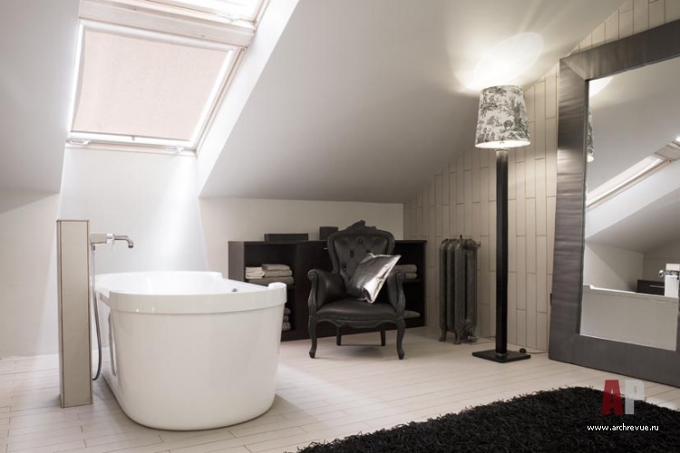 Квартира находится в надстроенном в старом доме мансардном объеме. Ее главная особенность – отсутствие бетонных перегородок. Общее пространство квартиры разделено единственной стеной. Она выполнена из прозрачного стекла и находится между лестницей и спальней.