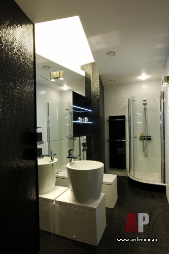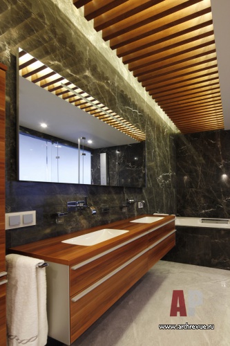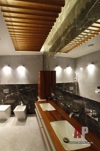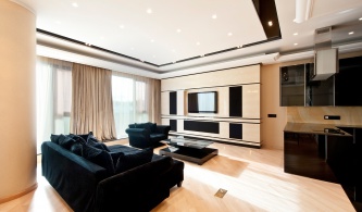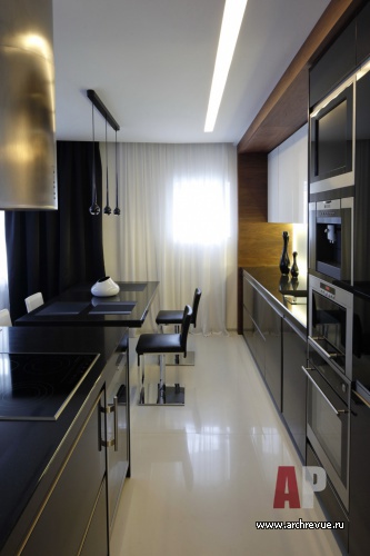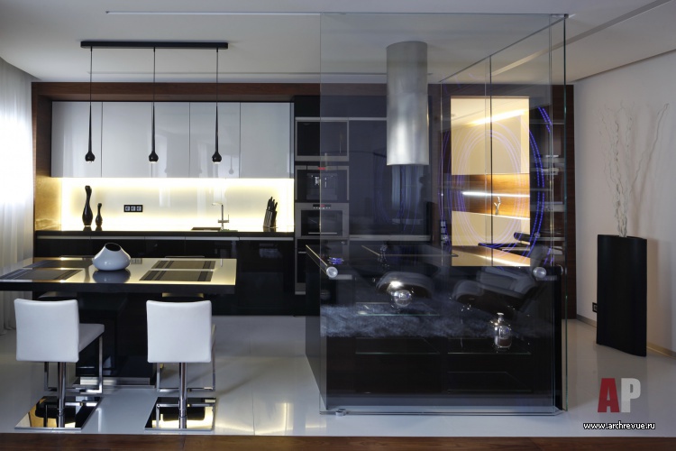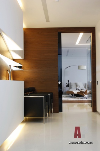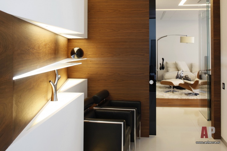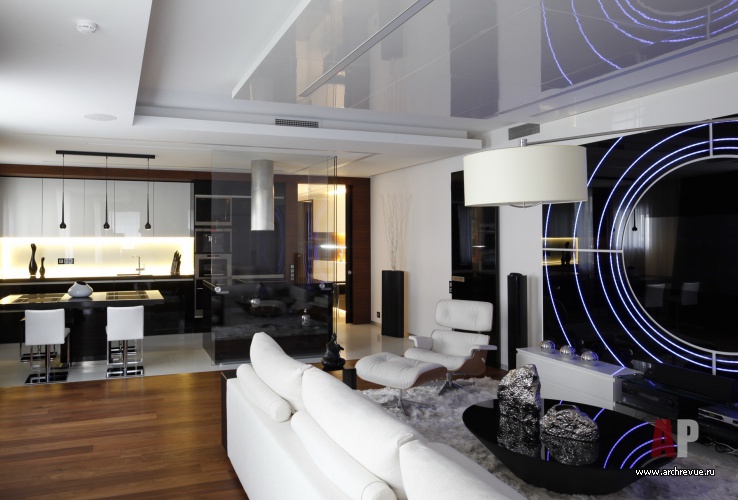 Интерьер решен на впечатляющем контрасте лакированных поверхностей, стекла (черного и прозрачного) и натурального дерева. Из древесины ореха выполнены деревянные панели в прихожей, навесной потолок в ванной и полы во всех жилых помещениях.