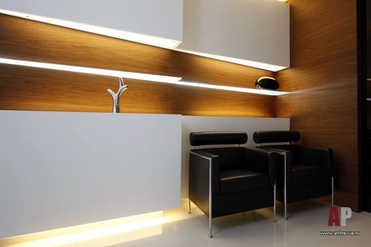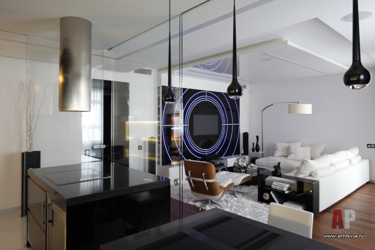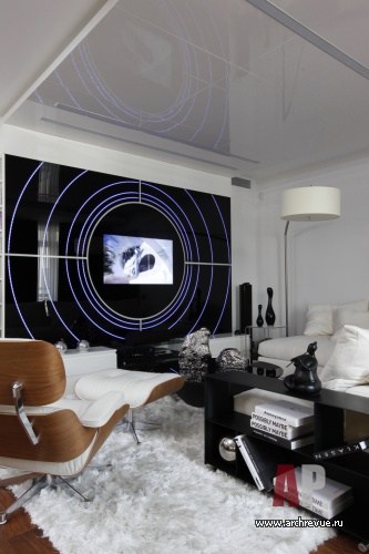 Доминанта общественного пространства – оригинальный домашний кинотеатр: в выключенном состоянии экран становится невидимой частью панно из черного стекла со светодиодами. Центрический светодиодный рисунок панно вызывает ассоциации с мишенью.