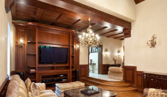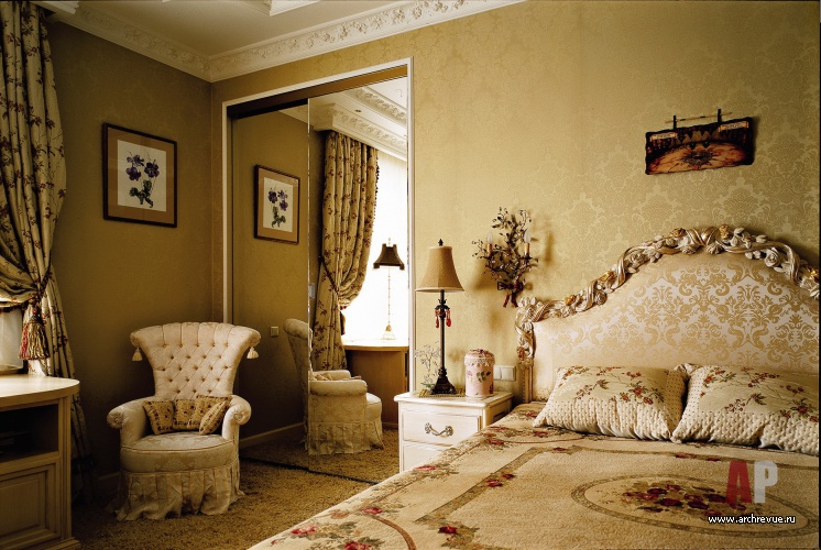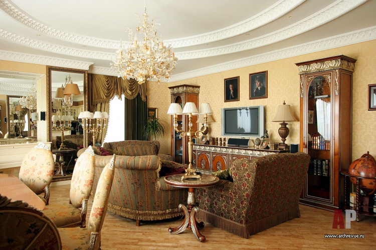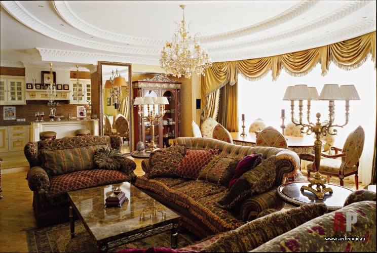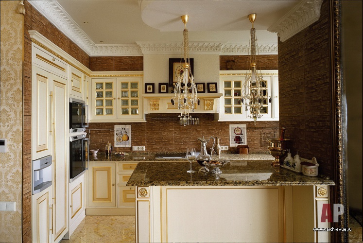 На полах – паркет из карельской березы (а в спальнях – уютное ковровое покрытие), на стенах – текстильные обои с дворцовой символикой. Зона кухни облицована керамической плиткой в стиле Прованс с фактурой необработанного природного камня, а многоуровневые потолки декорированы пышным лепным дtкорм с растительным орнаментом.