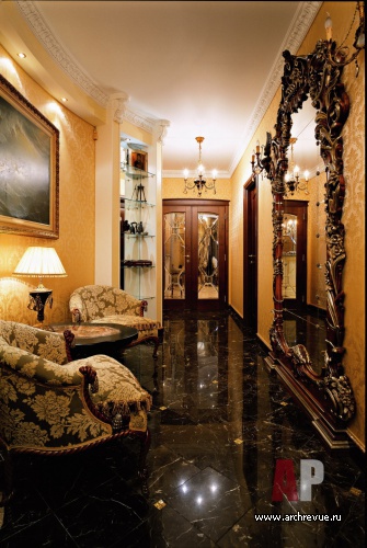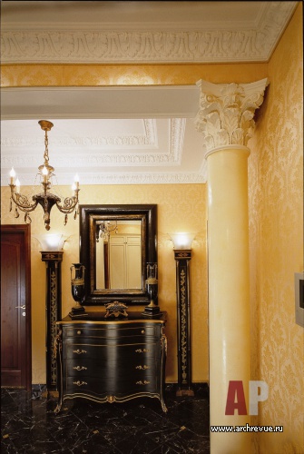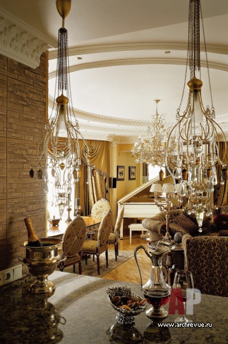 Перед авторами проекта стояла непростая задача создать интерьер в духе дворцовой классики в небольшом объеме городской квартиры. И вдохнуть в парадную обстановку уют и негу, создавая по-настоящему роскошную вариацию на вечную тему классики.